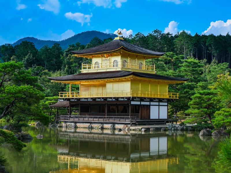 - Chùa Vàng Kinkakuji (金閣寺) – là một trong những di sản văn hóa nổi bật nhất tại Kyoto, Nhật Bản. Được biết đến với sự lộng lẫy và tráng lệ, chùa Vàng Kinkakuji tỏa sáng bởi hai tầng trên cùng được phủ lớp vàng lá bóng loáng rực rỡ, biểu trưng cho nghệ thuật kiến trúc độc đáo và lịch sử phong phú của Nhật Bản..
