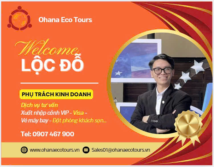 Kể từ ngày 15/03/2025, Ohana Eco Tours vui mừng giới thiệu nhân sự Phụ trách Kinh doanh dịch vụ xuất nhập cảnh VIP, dịch vụ tư vấn visa các nước, hộ chiếu, vé máy bay, đặt phòng khách sạn trong và ngoài nước...